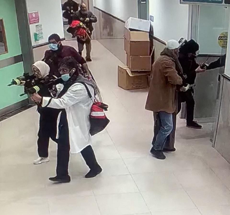 CCTV circulated online appeared to show around a dozen undercover troops, including three in women's clothing and two dressed as medical staff, pacing through a corridor of the hospital with assault rifles.
