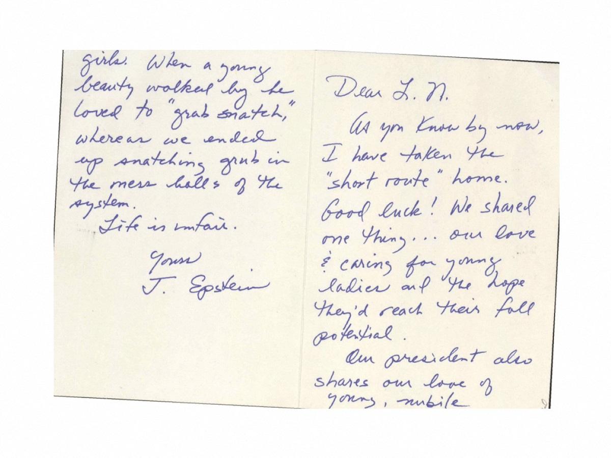 Epstein's card also includes the message: "As you know by now, I have taken the 'short route' home," a possible allusion to suicide. Epstein was found dead in his cell on August 10, 2019. The Justice Department has said that he killed himself.