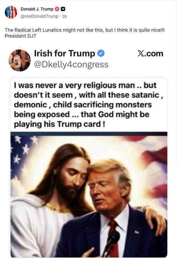 The image, reposted to Trump's Truth Social account, shows Trump with his eyes closed, touching temple-to-temple with a similarly posed Jesus. Trump is standing behind a microphone, and behind him is an American flag. The original post had the caption: "I was never a very religious man .. but doesn't it seem, with all these satanic, demonic, child sacrificing monsters being exposed ... that God might be playing his Trump card!"