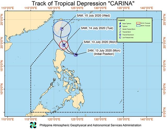 "The center of Tropical Depression 'CARINA' is forecast to turn northwestward and move over the Luzon Strait, passing close to the northeastern portion of Cagayan and Babuyan Islands between tonight and tomorrow morning," PAGASA said, adding "a landfall scenario over these areas remains a possibility."
