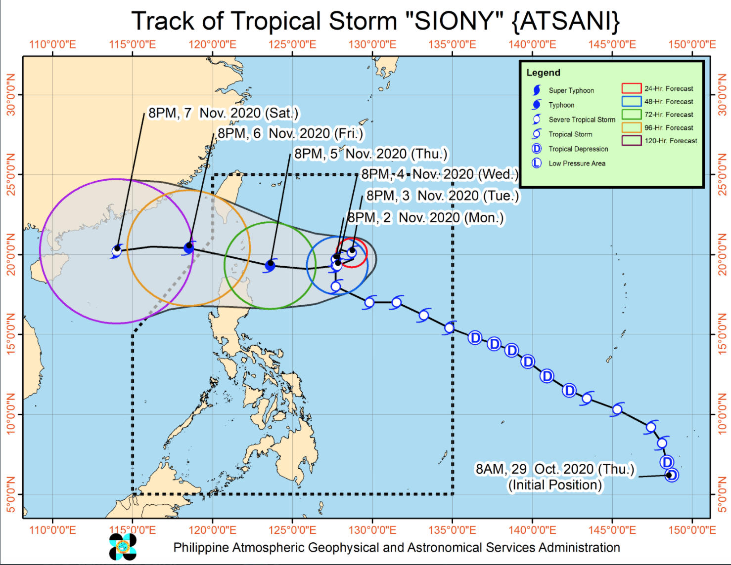 By Tuesday evening, Siony will be 705 kilometers east of Basco, Batanes then on Wednesday evening, will move to 665 kilometers east of Calayan, Cagayan.