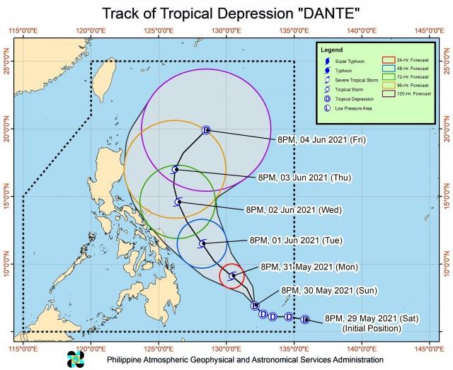 At 10 p.m., Dante was 685 kilometers east of Davao City with 55 kilometers per hour center winds that can gust up to 70 kph.