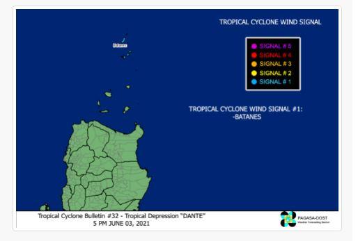 Tropical Cyclone Wind Signal No. 1 was raised over Batanes as tropical storm Dante weakened into a tropical depression, PAGASA said Friday.