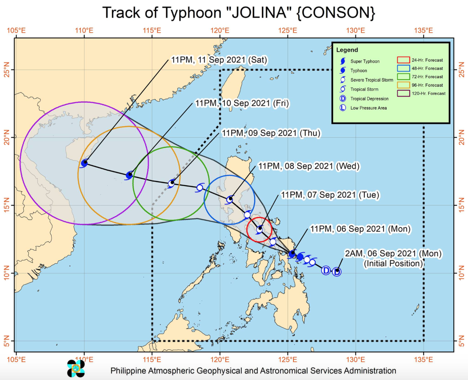 Jolina will move generally northwestward across the Eastern Visayas-Southern Luzon area in the next 36 hours and will cross Samar and Bicol Region on Tuesday or Wednesday morning before emerging over Lamon Bay by noontime also on Wednesday.