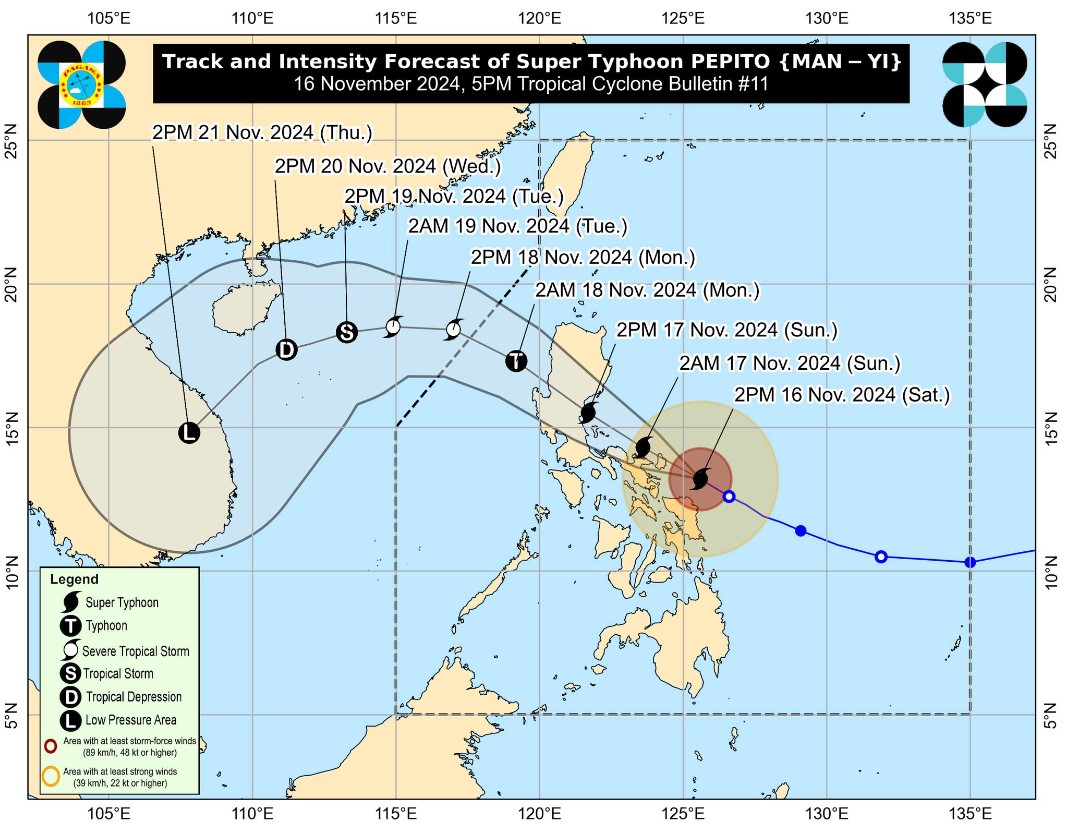 "PEPITO will likely make landfall over Catanduanes as a super typhoon at or near peak intensity, and as a super typhoon or typhoon over the Quezon-Aurora area. Significant weakening will occur during the passage of PEPITO over mainland Luzon tomorrow, but it will likely remain as a typhoon until it reaches the West Philippine Sea," PAGASA said.