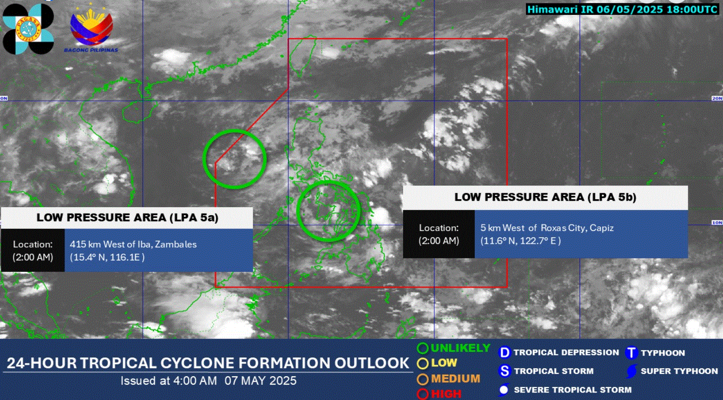 Weather bureau PAGASA said it is monitoring two low pressure areas (LPA) inside the Philippine Area of Responsibility forecast to trigger rains in the Visayas and parts of Luzon.