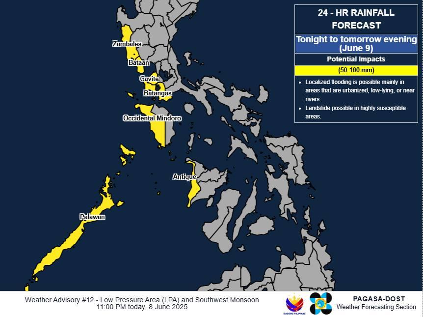 According to the state weather bureau’s advisory released 11 p.m. on Sunday, 50 millimeters to 100 millimeters of rainfall is expected in Zambales, Bataan, Cavite, Batangas, Occidental Mindoro, Palawan, and Antique until Monday evening due to the Habagat.