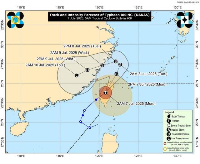Typhoon Bising (international name: Danas) is expected to exit the Philippine Area of Responsibility (PAR) on Monday morning, but it is enhancing the Southwest Monsoon (Habagat) which will bring rains, according to PAGASA's 5 a.m. tropical cyclone bulletin.