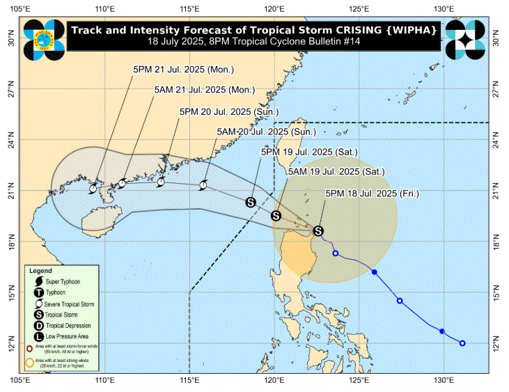 Tropical Storm Crising maintained its strength as it nears Sta. Ana, Cagayan, according to PAGASA's tropical cyclone bulletin issued at 8 p.m.