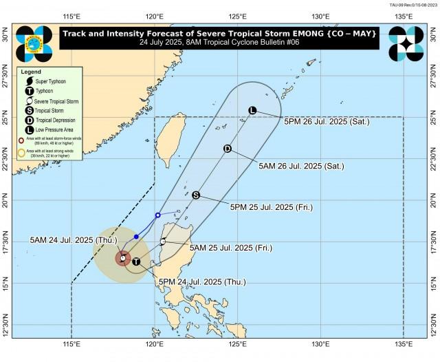 “On the forecast track, EMONG may pass close to Pangasinan this afternoon and may make landfall over Ilocos Region tonight or tomorrow early morning. After traversing Northern Luzon, the center of EMONG will re-emerge over the Luzon Strait and may pass close to Babuyan Islands,” PAGASA said.
