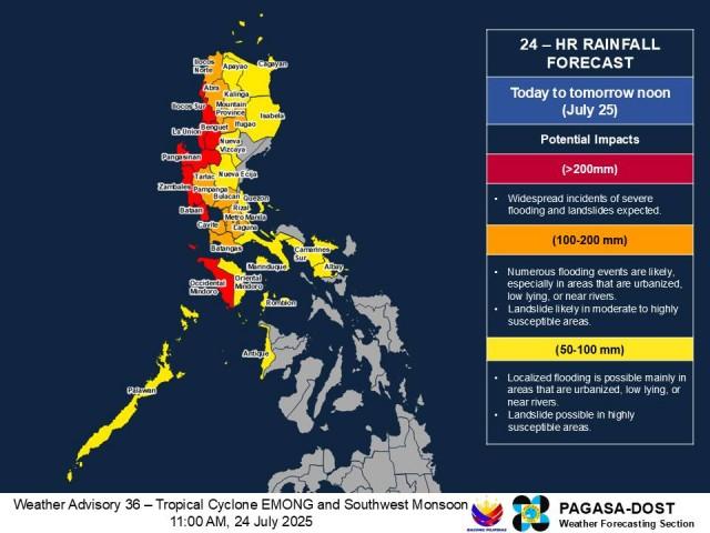 Habagat, which is enhanced by Dante and Emong, will also bring over 200 mm of rainfall in Bataan and Occidental Mindoro from Thursday to Friday noon.