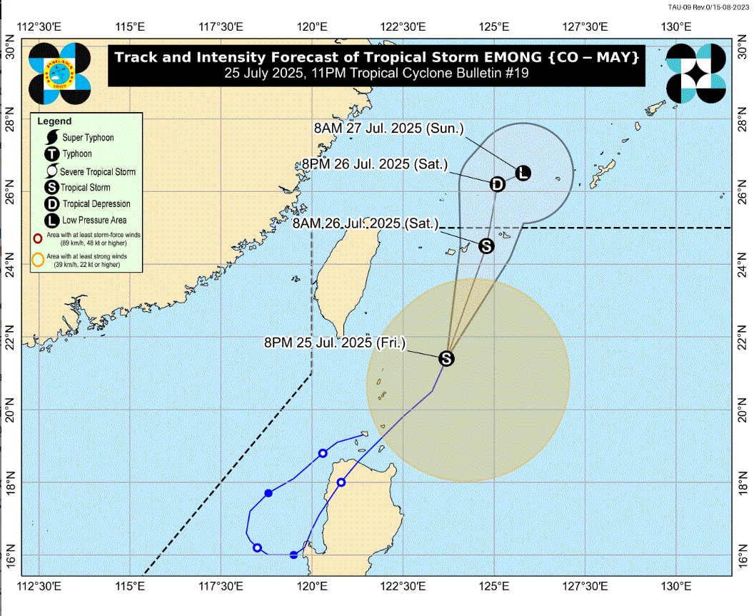 "Emong will continue to weaken throughout the forecast period due to increasing unfavorable environment. It will likely degenerate into a remnant low tomorrow evening or Sunday (27 July) morning while entering the East China Sea. However, a slightly faster weakening trend is not ruled out," PAGASA said. —LDF, GMA Integrated News