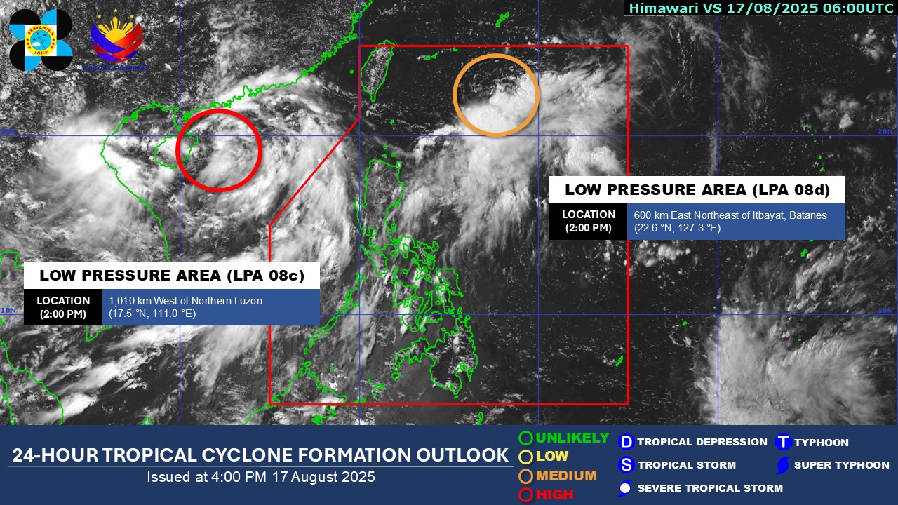 Meanwhile, the LPA observed outside PAR has a “high” chance of turning into a storm, PAGASA said