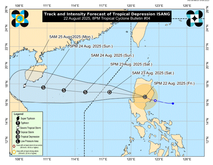 PAGASA said that the tropical depression will traverse northern Luzon and emerge over the West Philippine Sea on Friday evening. It will later exit the Philippine Area of Responsibility either in the morning or afternoon of Saturday, August 23, it added.