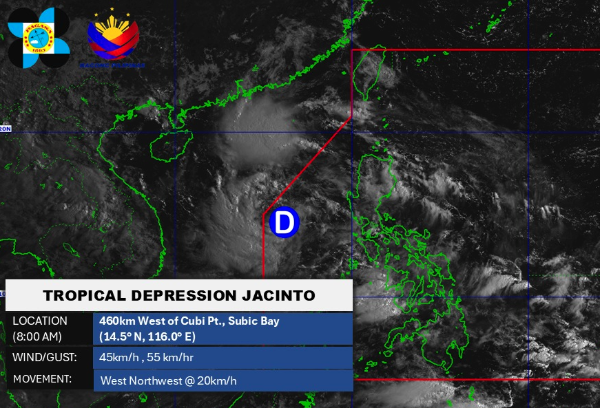 “At 8:00 AM today, the Low Pressure Area west of Subic Bay developed into Tropical Depression ‘JACINTO,’” PAGASA said in an update.