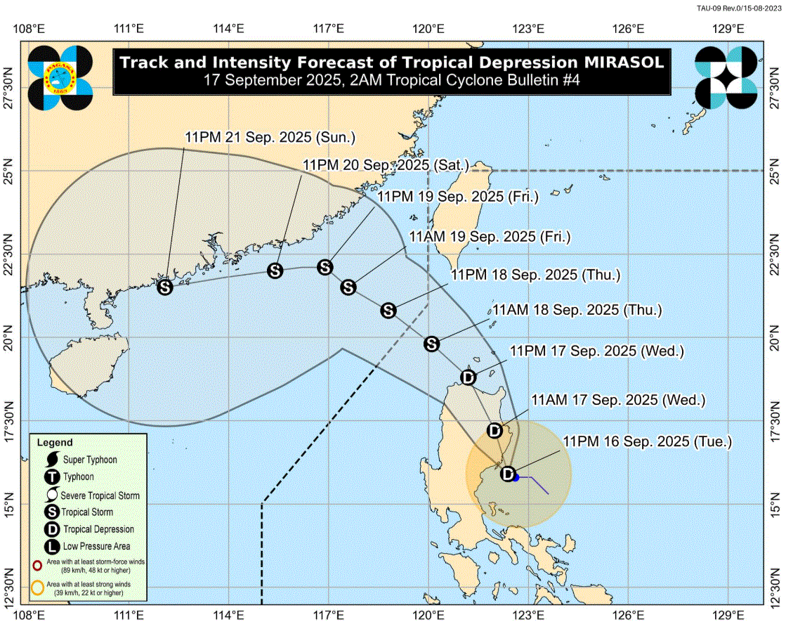 In its 2 a.m. tropical cyclone bulletin, the weather bureau said that based on the intensity forecast, Mirasol will likely intensify into a tropical storm when it re-emerges over the Luzon Strait.