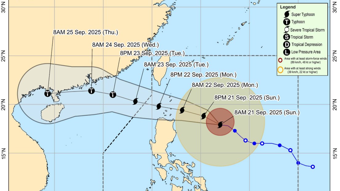 The super typhoon is moving westward at 15 km/h. It has strong to typhoon-force winds extend outwards up to 530 km from the center.