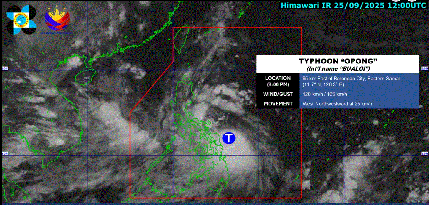 The center of Opong was monitored over the coastal waters of Dolores, Eastern Samar. It has maximum sustained winds of 120 kilometers per hour near the center, and gustiness of up to 165 kilometers per hour.