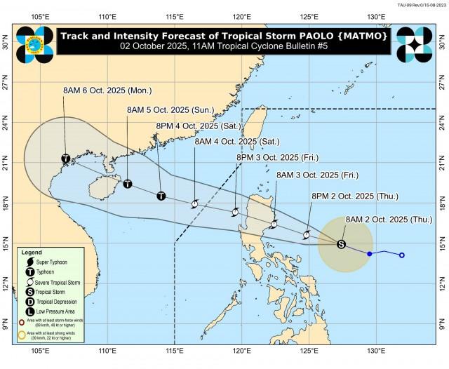 "PAOLO may make landfall over southern Isabela or northern Aurora tomorrow (03 October) morning... Further intensification into a typhoon prior to landfall is not ruled out," PAGASA said.