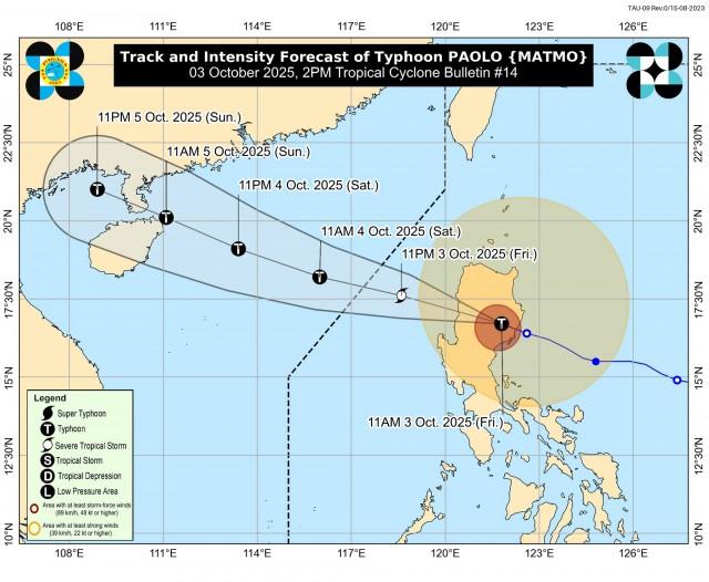 “On the forecast track, PAOLO will cross the landmass of Northern Luzon today, and emerge over the West Philippine Sea this afternoon or evening. It will exit the Philippine Area of Responsibility tomorrow (04 October) morning,” PAGASA said.