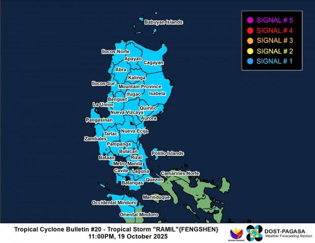 Signal No. 1 has been hoisted over most of Luzon as Tropical Storm Ramil continues to move west-northwest away from the Philippine landmass, PAGASA said Sunday evening.