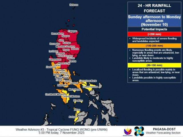 According to PAGASA’s Weather Advisory No. 3 for Uwan, Camarines Sur, Catanduanes, and Albay will have more than 200 mm of rainfall from Saturday afternoon to Sunday afternoon.