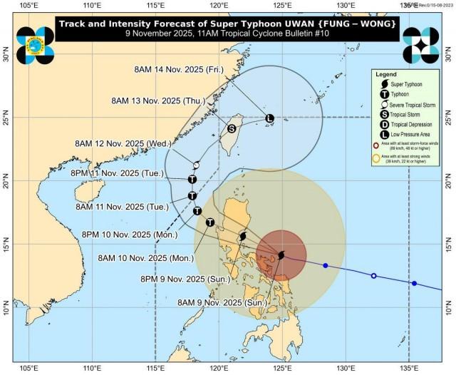 “Uwan will begin to turn northwestward to northward from tomorrow to Tuesday (11 November) while remaining at typhoon category,” it added.