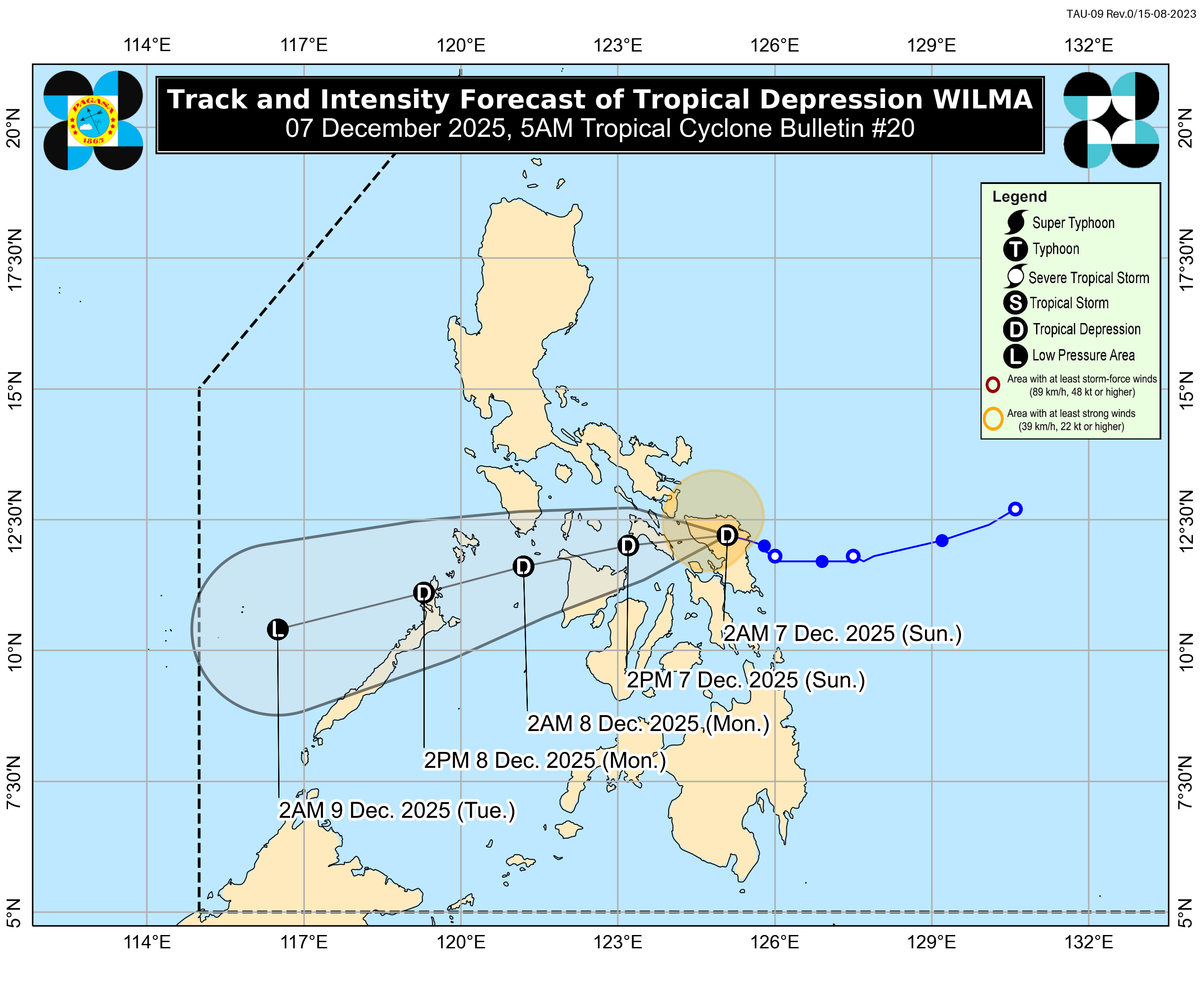 PAGASA said Wilma is moving west-southwest at 15 km/h and is expected to traverse Southern Luzon and the Visayas throughout the day before emerging over the Sulu Sea. It may pass over northern Palawan by Monday morning or afternoon.