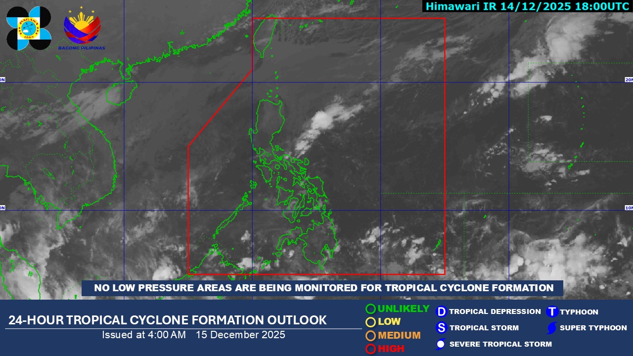 PAGASA added that there are no low pressure areas (LPAs) being monitored for tropical cyclone formation so far.