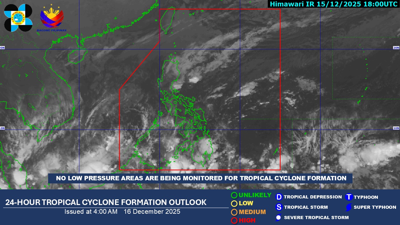 PAGASA said there are no low pressure areas (LPAs) being monitored so far for possible tropical cyclone formation.