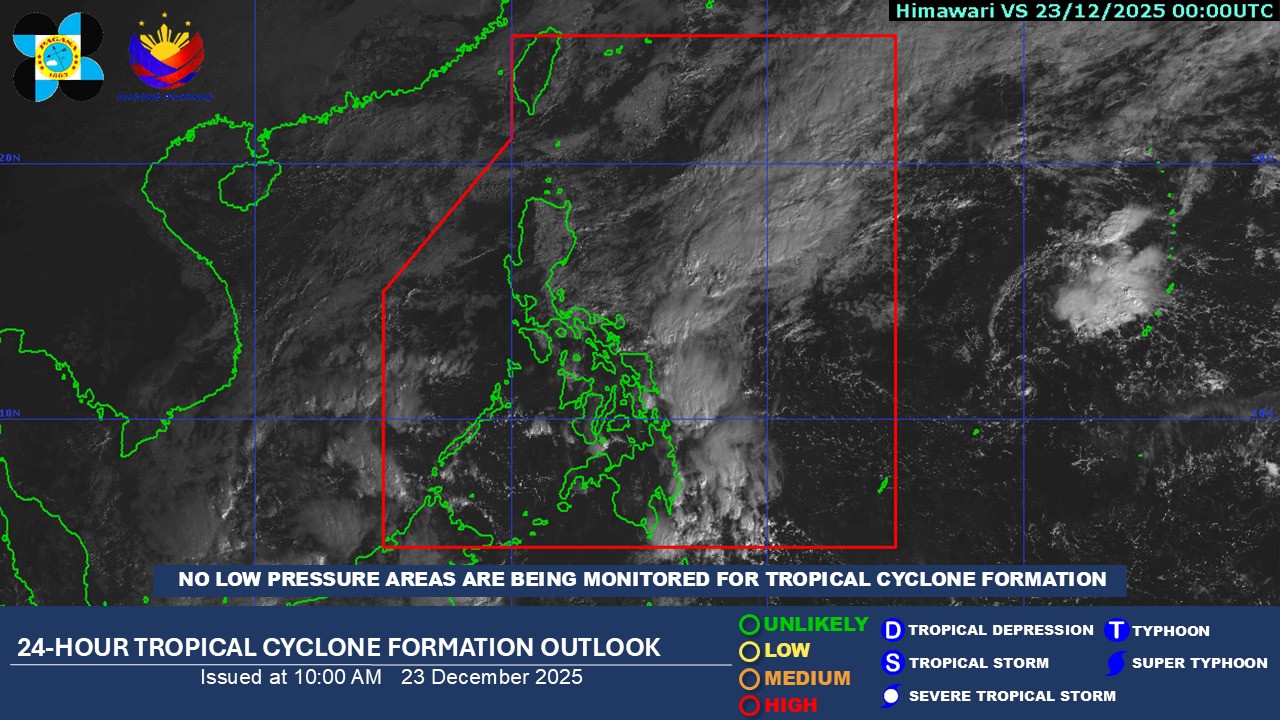 Meanwhile, the Bicol Region, Eastern Visayas, Dinagat Islands, Surigao del Norte, Quezon, and Surigao del Sur will experience cloudy skies with scattered rain and thunderstorms due to the easterlies.