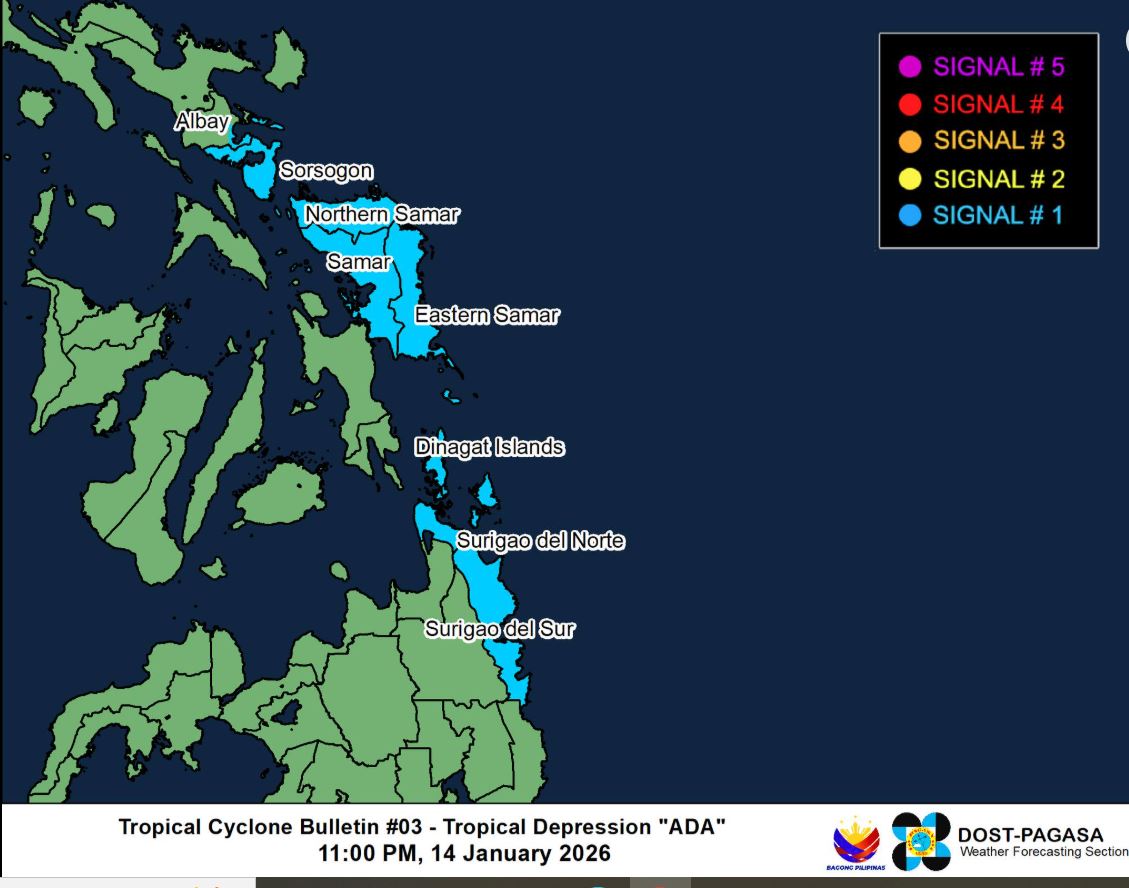 PAGASA said that Ada will move generally northwestward over the next three days. It is forecast to pass close or make landfall over Eastern Visayas on Friday, January 16, or the early morning of Saturday, January 17.
