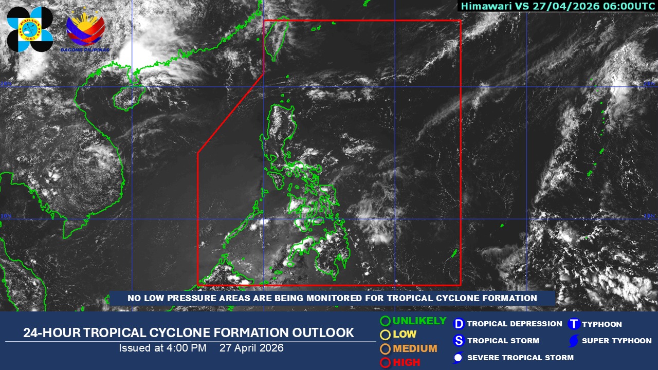 As of 2:00 p.m. PAGASA said "no Low Pressure Areas (LPA) are being monitored for Tropical Cyclone Formation."
