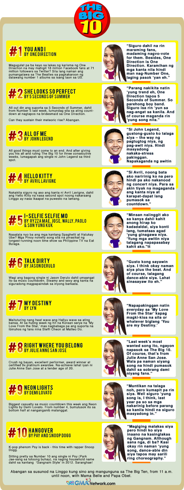 Excited na ba kayong malaman kung sino ang bagong may hawak ng titulo? Relax as we review our list of songs mula sa nag-iisang countdown na panalo sa inyong mga puso , The Big 10.