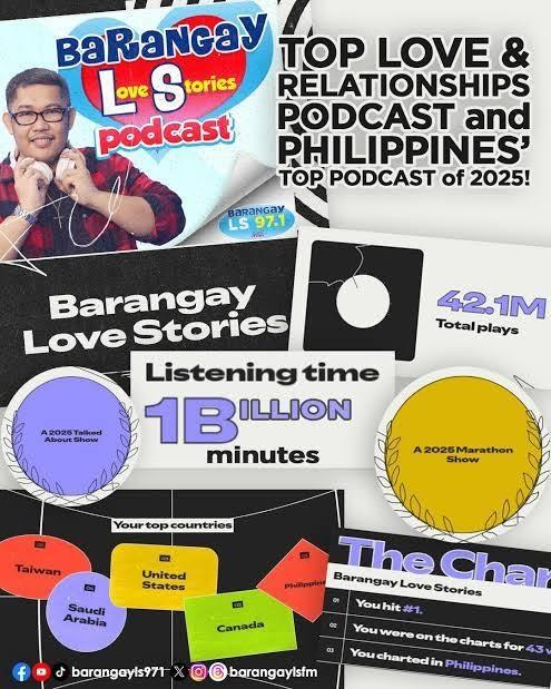"Barangay Love Stories " won as the "Top Love & Relationship Podcast" and "Top Podcast in the Philippines 2025."