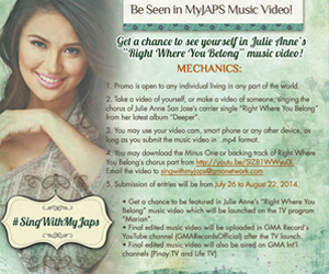 Get a chance to be seen in Julie Anne’s “Right Where You Belong” music video via #singwithmyjaps. Read more
