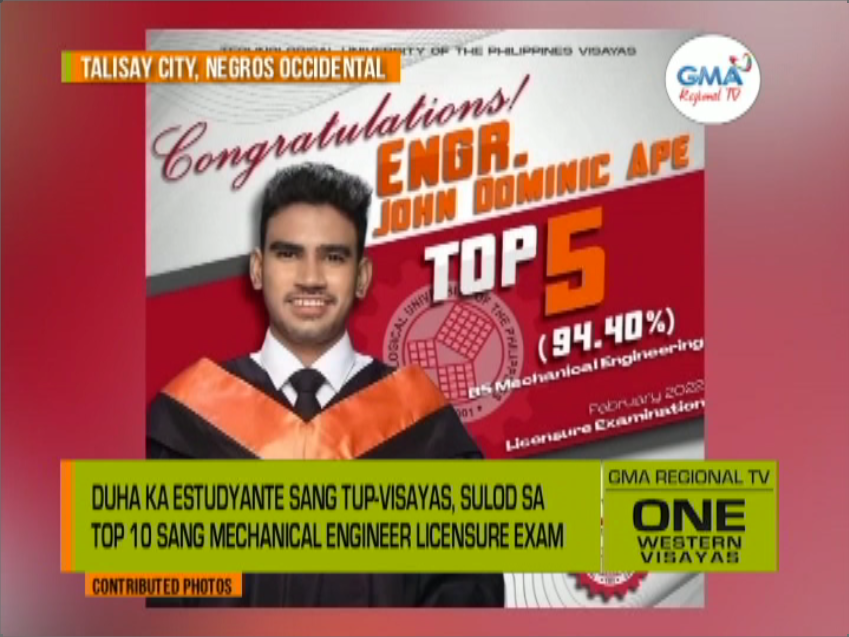 Duha ka estudyante sang TUP-Visayas, sulod sa top 10 sang Mechanical Engineer Licensure Exam. Isa ka topnotcher, ginahalad sa iloy nga nagalibod alupe kag bukayo ang iya kadalag-an. See what's fresh from your firsthand source of local news, events, and activities— visit the official website of GMA Regional TV: www.gmaregionaltv.com Subscribe to GMA Regional TV's official YouTube channel: https://www.youtube.com/c/GMARegionalTV Follow us on Facebook, Twitter, and Instagram: @gmaregionaltv #GMARegionalTV #LocalNewsMatters